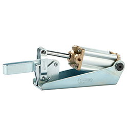 表面硬化鋼板部件。硬化和回火支撐樞軸。支撐襯套(適用于200 daN及以上的尺寸)經(jīng)過表面硬化和研磨。底座由黑色涂漆球墨鑄鐵制成。其他零件由鍍鋅(可焊接)鋼制成。支撐樞軸經(jīng)過表面硬化處理。加強(qiáng)型重型系列:基體采用黑色磷化鋼板;水泥和地面支撐銷和襯套。雙作用氣缸,減震可調(diào)。該系列工具的制造易于拆卸:樞軸通過定位環(huán)軸向固定。該系列結(jié)合了肘節(jié)動(dòng)作的優(yōu)點(diǎn)(即使在壓力損失的情況下工具保持關(guān)閉)和氣動(dòng)裝置提供的可能性。